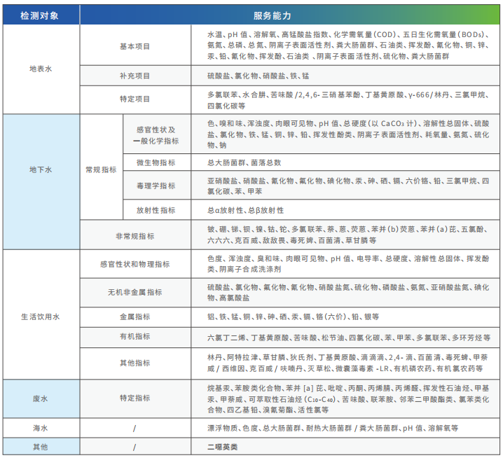 公司'σ≈可(kě)開(kāi)展各類水(shuǐ)質定制(zhì)化(↑♠huà)檢測方案,針對(duì)水(shuǐ)質微(wēi)生(γλ₹shēng)物(wù)指标、毒理(lǐ)指标、放(±∑✔☆fàng)射性指标、感官性狀及一(yī)般化(huà)學指标以及放(¥©fàng)射性指标進行(xíng)檢測并出£₩≠具檢測報(bào)告。我公司檢測能(néng)±β™力覆蓋《地(dì)表水(shuǐ)環境質量标準》(GB 3838)、《地(d±→•ì)下(xià)水(shuǐ)質量标準》(GB/T 14848)、《☆¶海(hǎi)水(shuǐ)水(shuǐ)質标準》(GB 3097)、《生δ↑∞ε(shēng)活飲用(yòng)水(shuǐ♦♣☆)衛生(shēng)标準》(GB 5749)及各類工(g♥δ> ōng)業(yè)水(shuǐ)污染排放(fàng)标準。